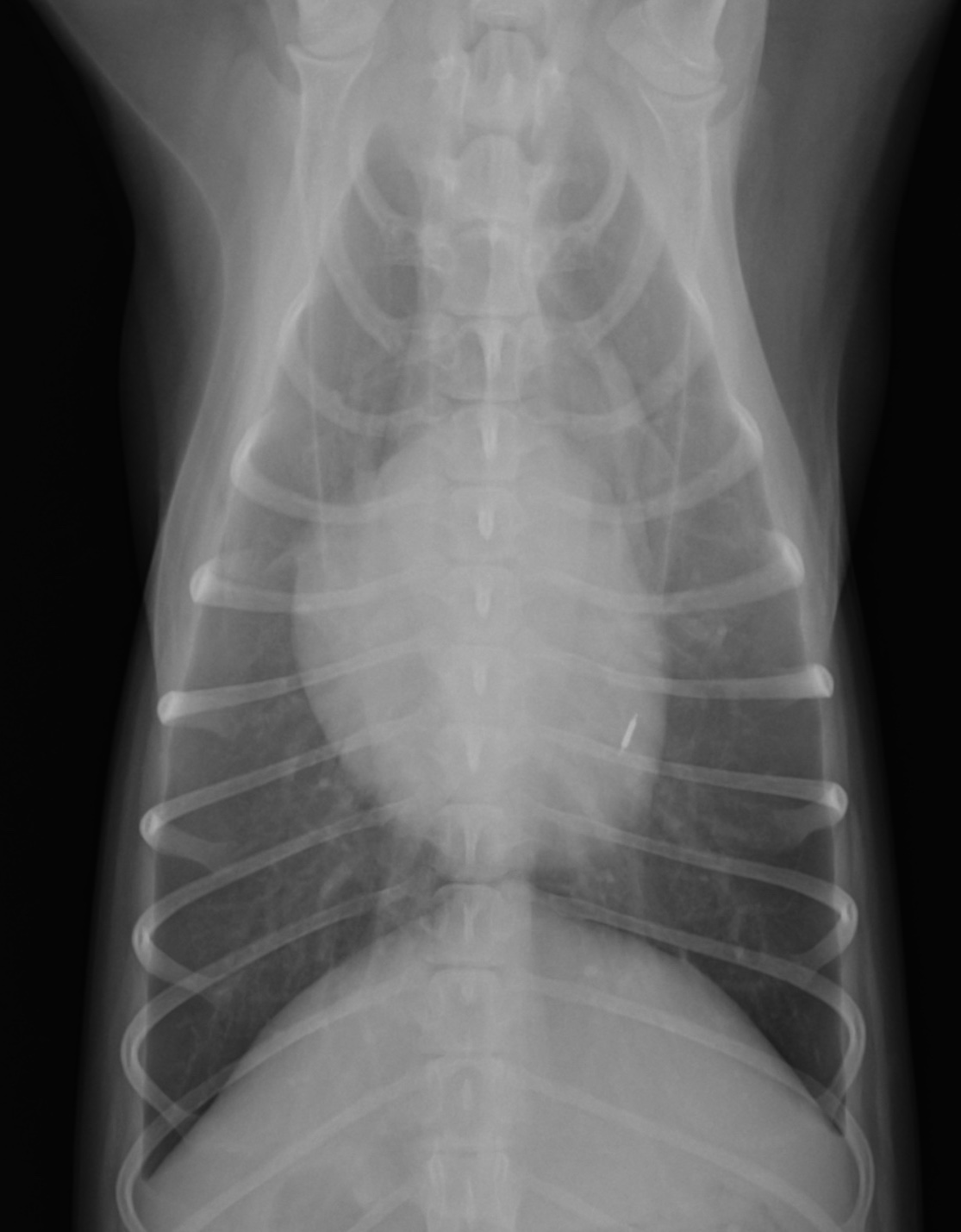 11歳のトイ・プードルちゃん。自宅で急に呼吸が荒くなったため来院されました。聴診にて左側心尖部にLevine Ⅳ/Ⅵの収縮期雑音が認められた。心原性肺水腫が疑われ、画像検査を実施しました。